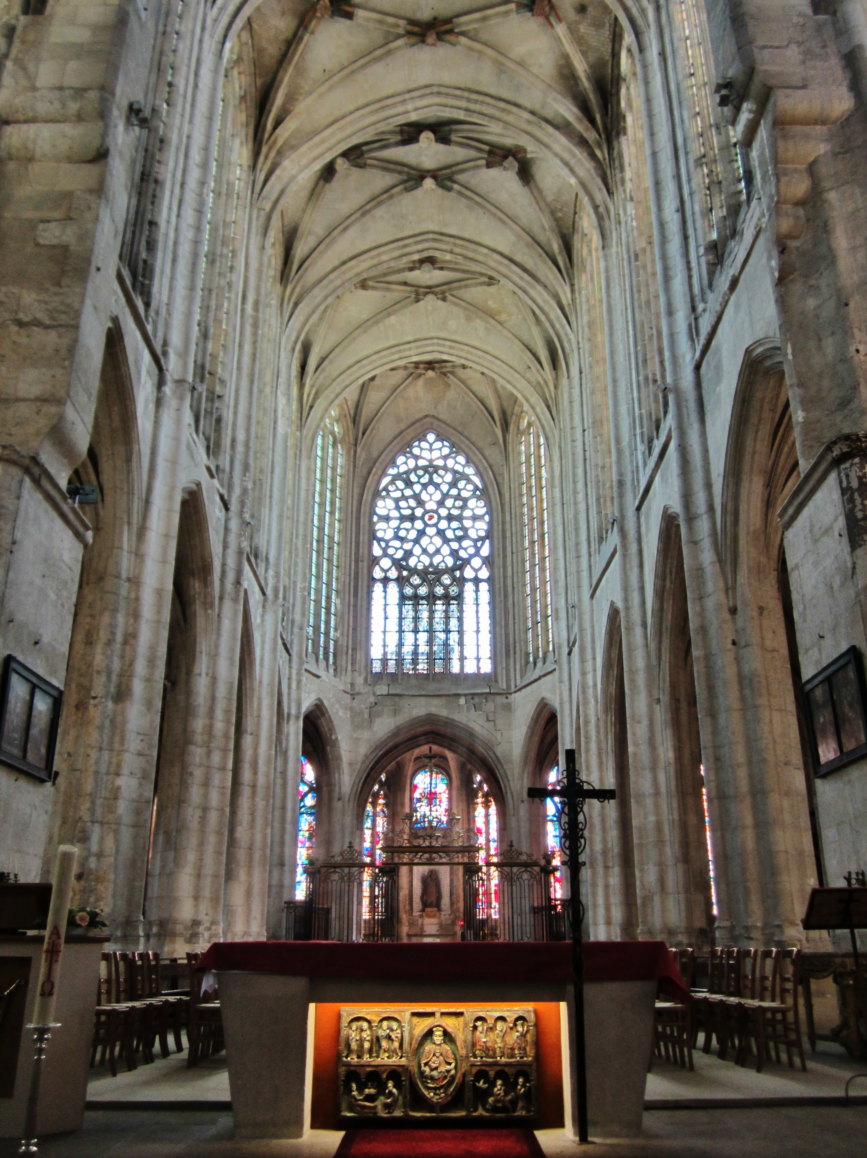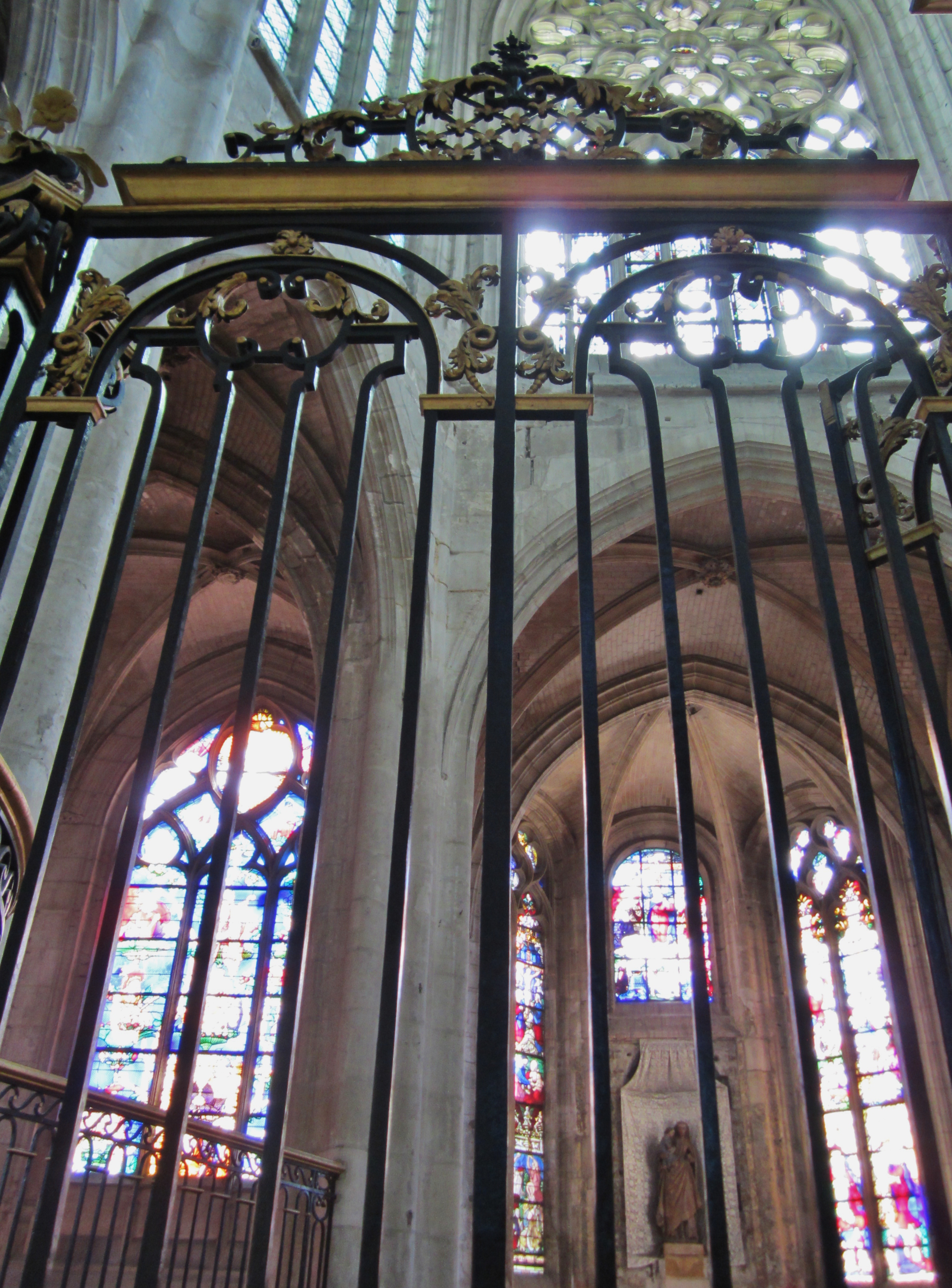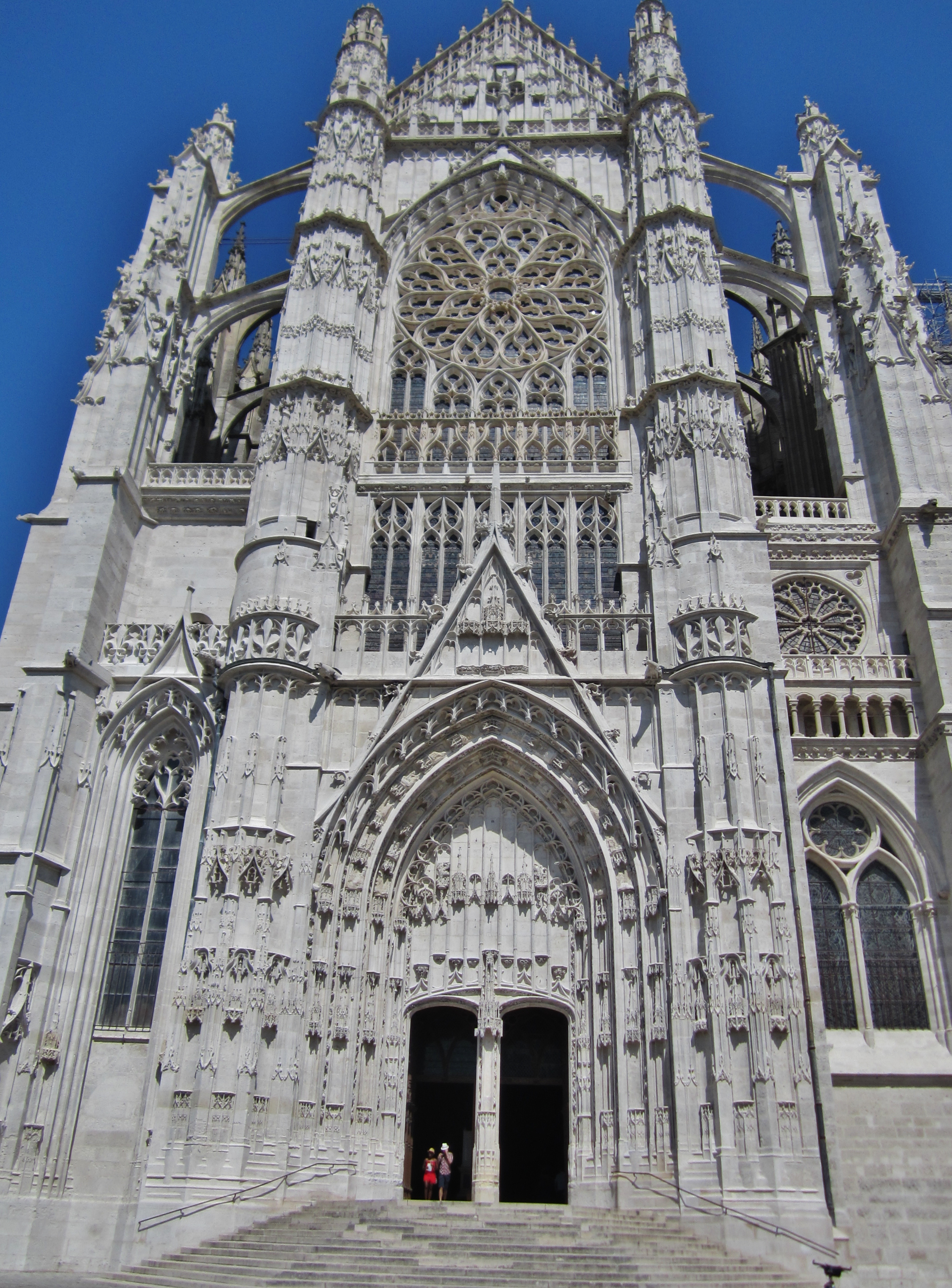 Cathédrale Saint-Pierre de Beauvais/Cathedral of St Peter of Beauvais is an incomplete Roman Catholic cathedral is the seat of the Bishop of Beauvais, Noyon and Senlis. It is, in some respects, the most daring achievement of Gothic architecture, and consists only of a transept (6thC) and choir, with apse and seven polygonal apsidal chapels (13thC), which are reached by an ambulatory.