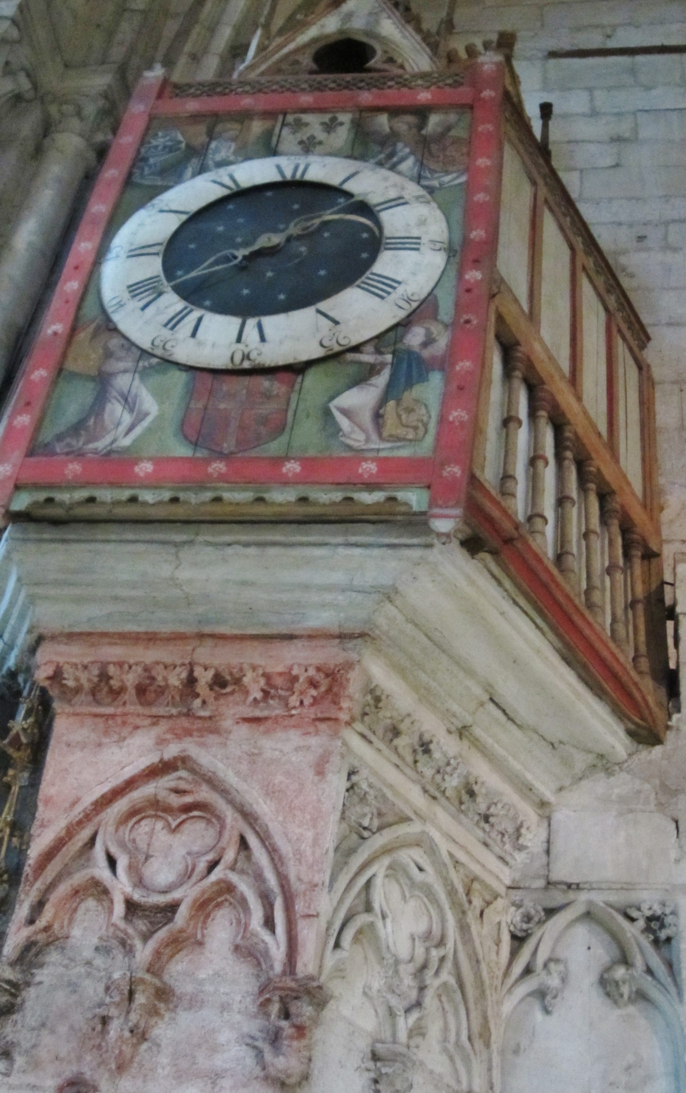 Several of the chapels contain medieval stained glass windows made during the 13th thru’ 15th Cs.There is a medieval clock (14th-15thC), probably the oldest fully preserved and functioning mechanical clock in Europe, a highly complicated astronomical clock with moving figures was installed in 1866.